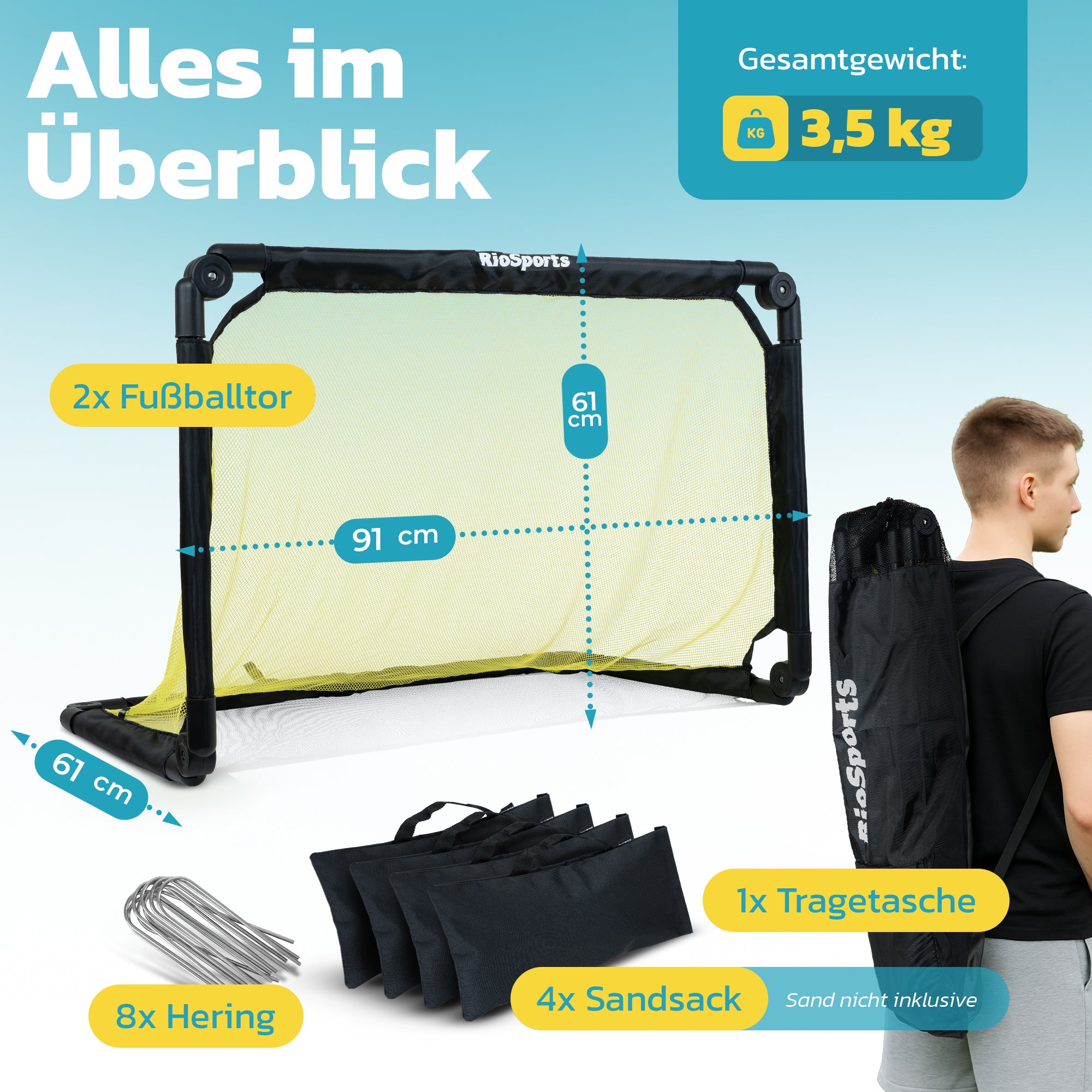 - Sommer, Winter oder Urlaub – Dein RioSports Fußballtor passt sich deinem Leben an. Einfach zusammenklappen, einpacken und für den nächsten Einsatz griffbereit halten.